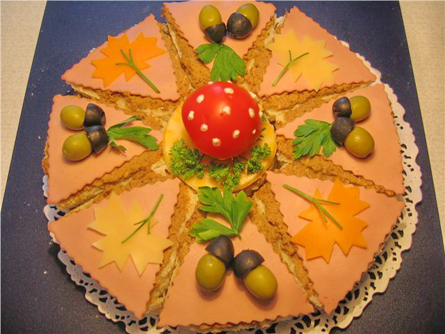 из ломтиков сыра желтого и оранжевого цвета вырезала по два кленовых листика, уложила на боковые части торта, на них положила веточки петрушки