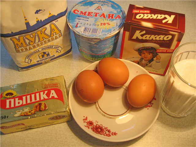 3 яйца, 100 г маргарина, 200 г сметаны (сметану можно заменить кефиром), 1 стакан песку, 1,5 ч.ложки соды, погашенной уксусом, 1,5 стакана муки, 2 ст.ложки какао, соль, ванилин (по желанию).